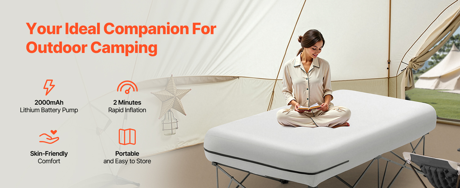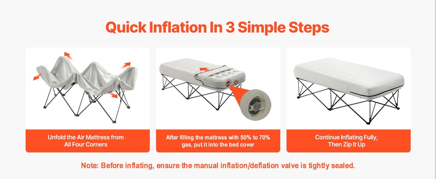- Quick Inflation: Simply open the storage bag, unfold the air mattress with frame, inflate halfway, insert into the cover, and continue inflating. With a 2000mAh rechargeable battery, it takes just 2 minutes to fully inflate. Setup is quick and easy.